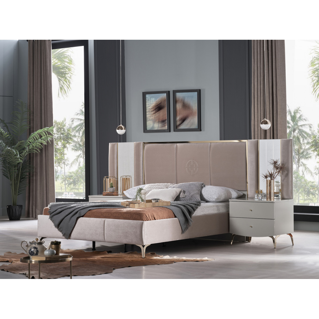 Спинка кровати щитовой конструкции из облицовочной плиты ДСП, с боковым и верхним накладным декоративным профилем (плита МДФ), профиль декорирован фитилем в цвете золота.