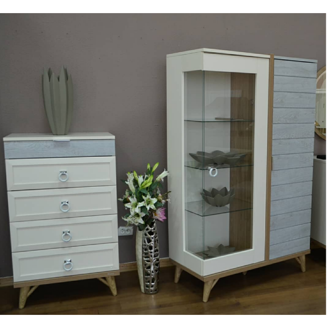 Двухдверная витрина для посуды и столовых принадлежностей из серии Mavenna выполнена в сочетании цветов данной серии: молочно-белый, серый с горизонтальной имитацией досок, цоколь на ножках и разделитель- в цвете орех. Стеклянные полки позволят выставить красивую посуду или коллекцию на обозрение. Высокие ножки облегчают уборку.