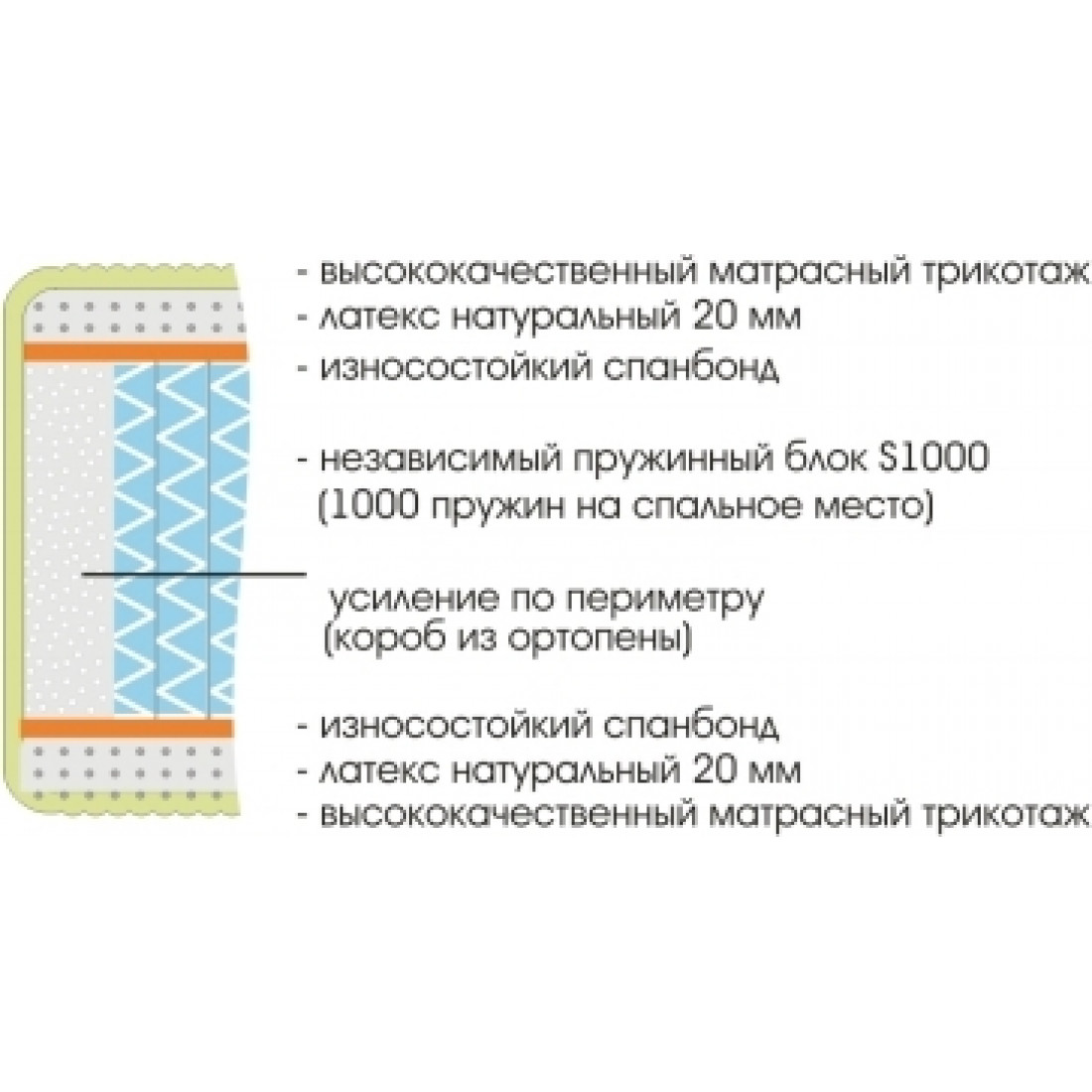 Наполнение: независимый пружинный блок S1000 (510 пр./кв.м), спанбонд, натуральный латекс 2см.