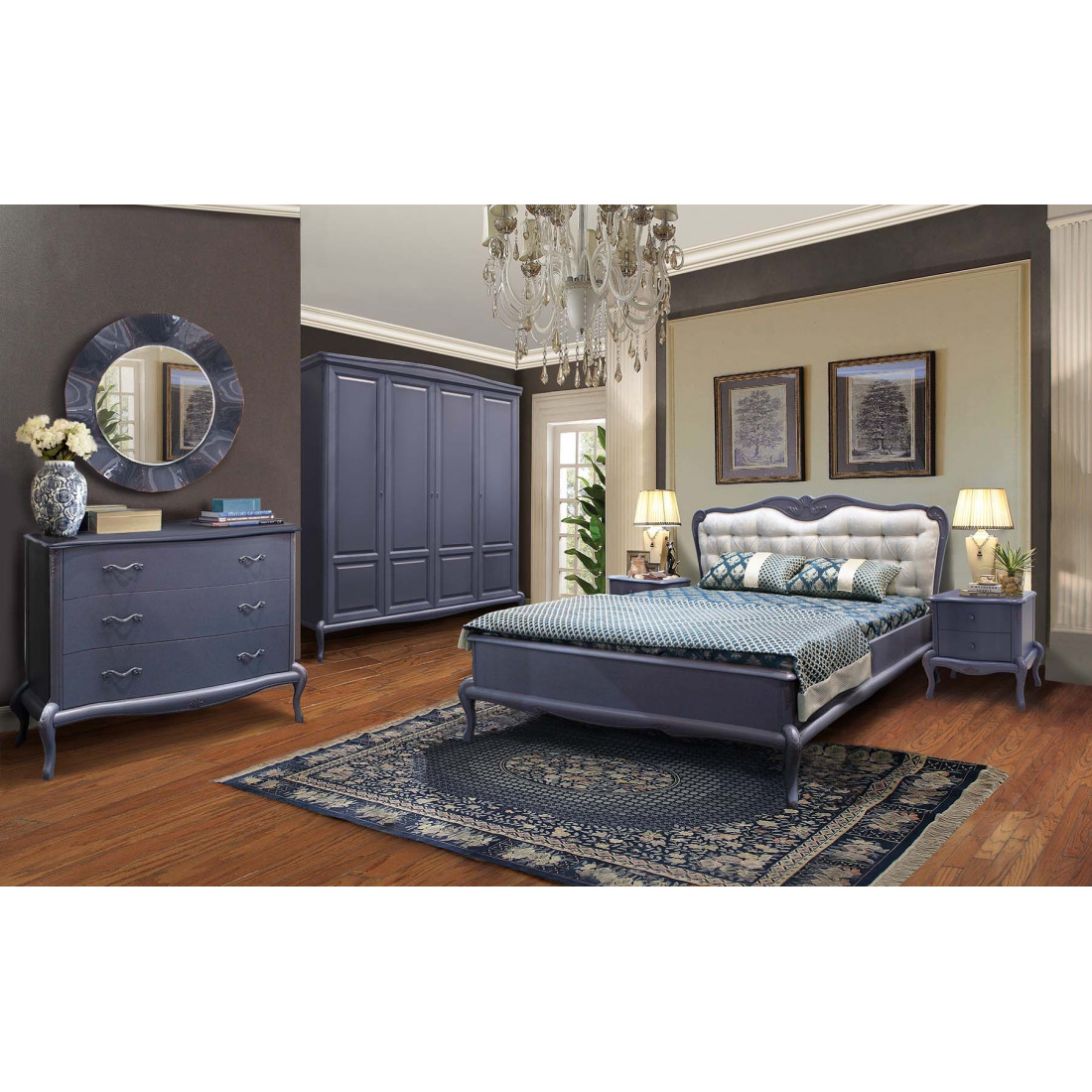 Набор выполнен с использованием массива дуба и бука, а так же шпона лиственных пород на лицевых поверхностях. Украшает изделия лицевая фурнитура, подобранная в тон к цвету изделия, витиеватая резьба, объёмный вид накладок ящиков.