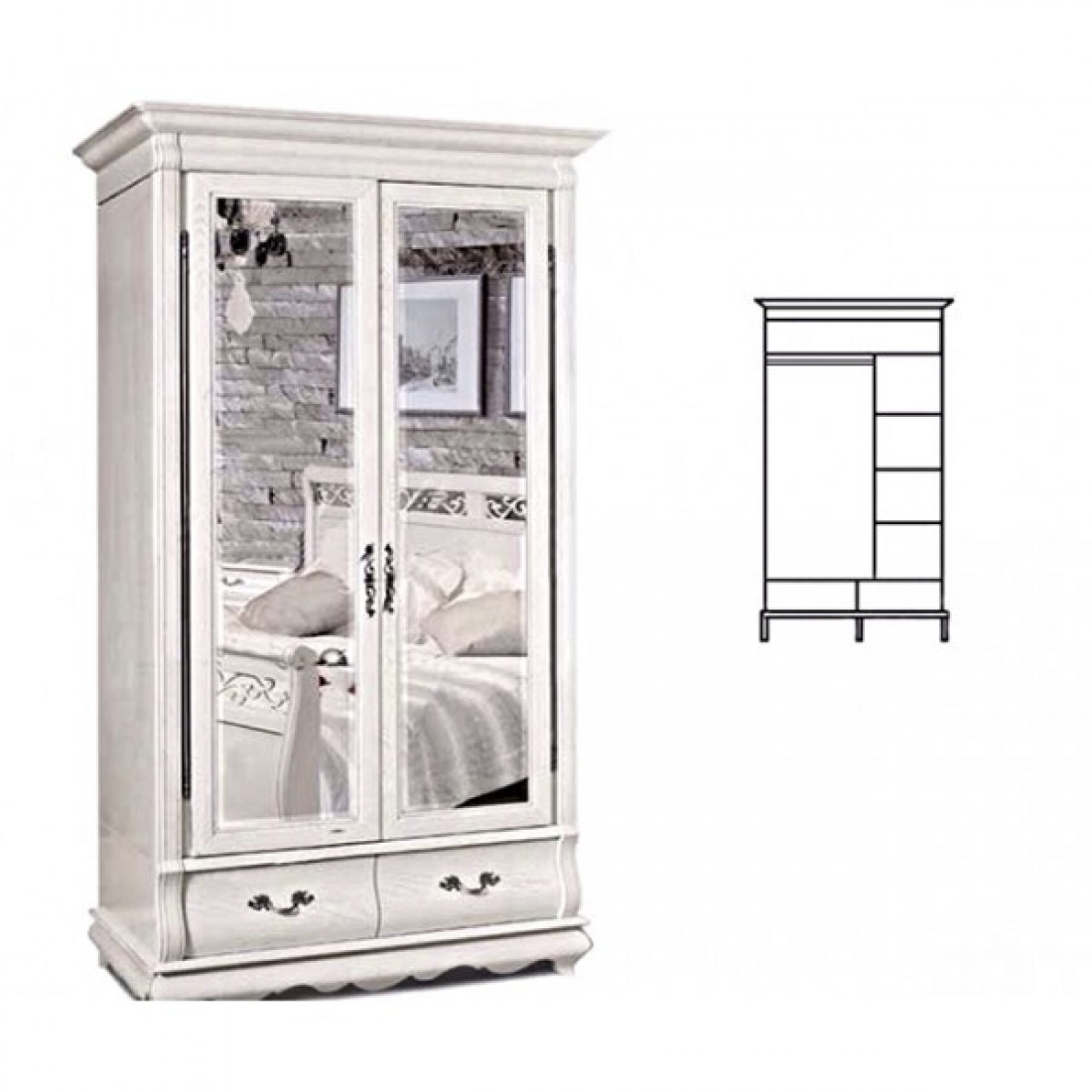 Классический двухдверный гардероб с зеркалами из коллекции мебели для спальни "Оскар" прекрасно впишется в интерьер спальни. Декорирован высокими карнизами и зеркальной поверхностью на дверцах. Модель выполнена в цветовом решении "Белая эмаль с патиной".