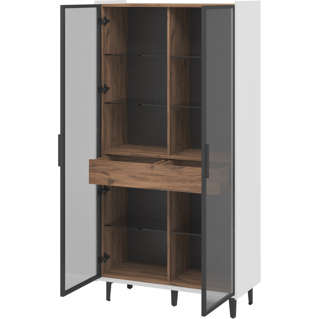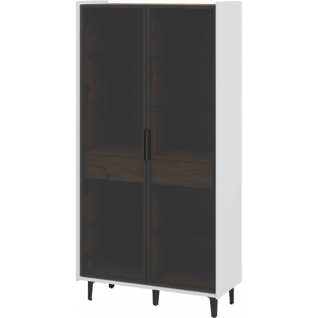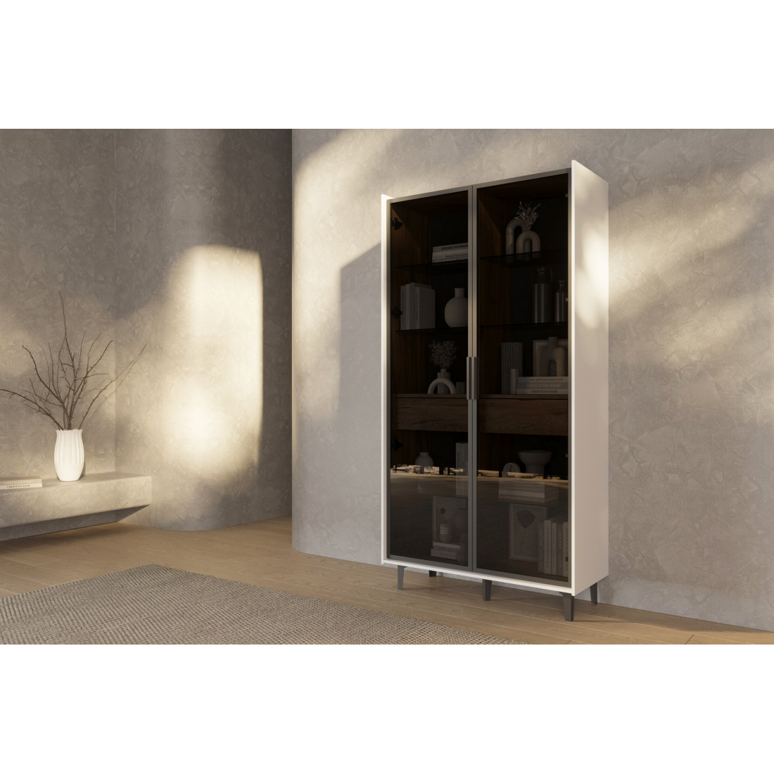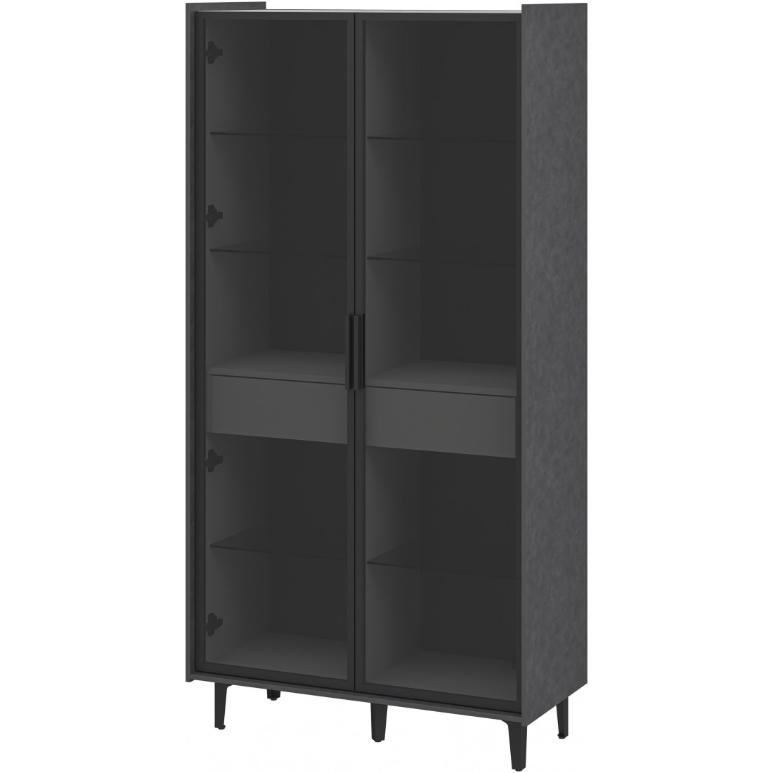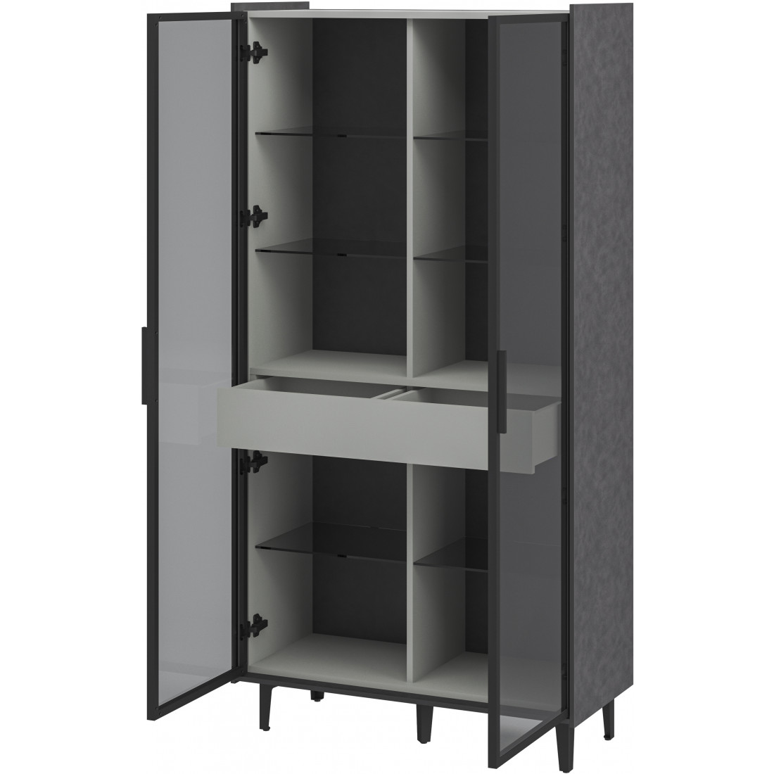 Элегантный шкаф Модена создает изысканную атмосферу в вашей гостиной. Предлагается в трех стильных вариантах цветов: Белый-Дуб Элисон, Лунный камень-жемчуг, Металл Бруклин-лунный жемчуг. Ножки из металла обеспечивают прочную поддержку. Темное стекло добавляет утонченности дизайну. Шкаф оснащен двумя отделениями с элегантными стеклянными полками и фасадами, между которыми находится большой ящик для удобного хранения. Идеальное решение для организации пространства в вашей гостиной