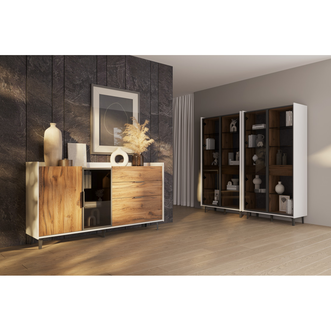 Элегантная тумба Модена создает идеальный акцент в вашей гостиной. Выберите из трех стильных вариантов цветов: Белый-Дуб Элисон, Лунный камень-жемчуг, Металл Бруклин-лунный жемчуг. Ножки из металла с регулировкой обеспечивают стабильность. Эта большая тумба идеально подходит для размещения телевизора и хранения посуды. Тумба оснащена темным стеклом и имеет три отделения: первое с двумя полками, второе с двумя стеклянными полками и фасадом из стекла, третье с тремя удобными ящиками. Функциональность и стиль объединяются в этой тумбе, делая ее идеальным дополнением к вашему интерьеру гостиной